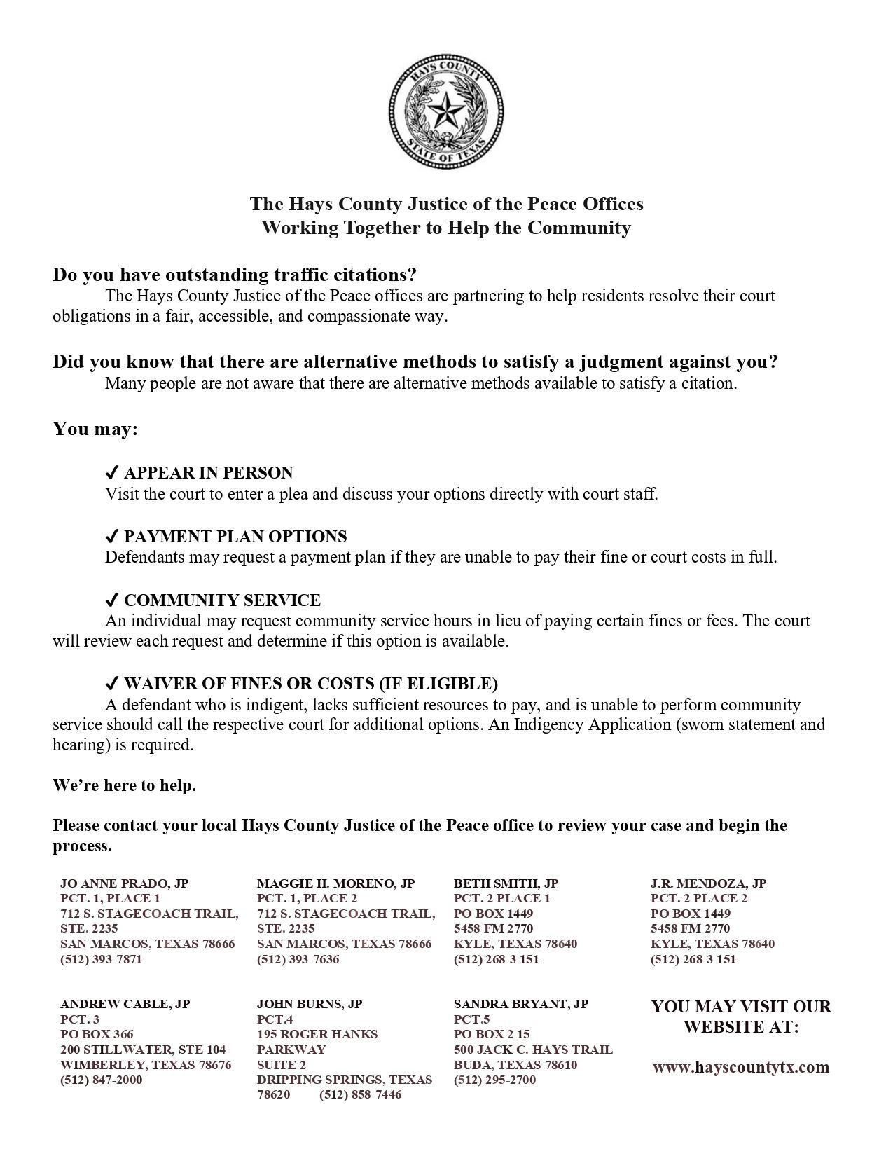 Hays County has seven Justices of the Peace: